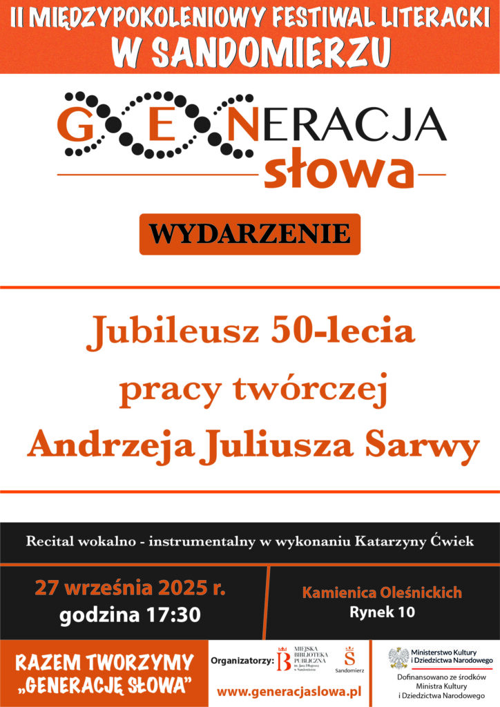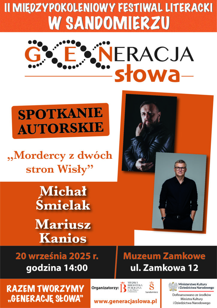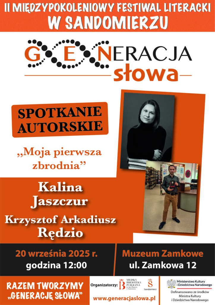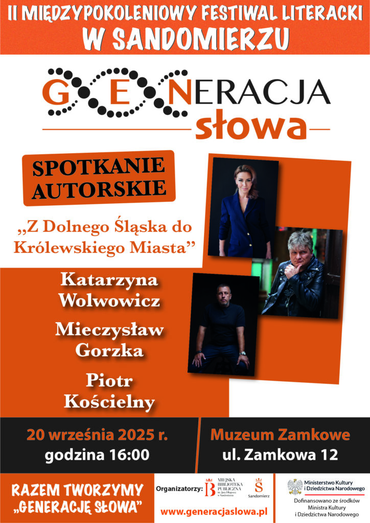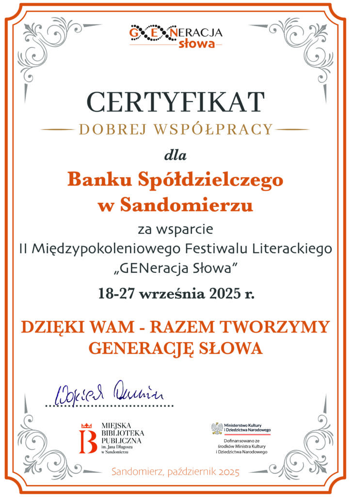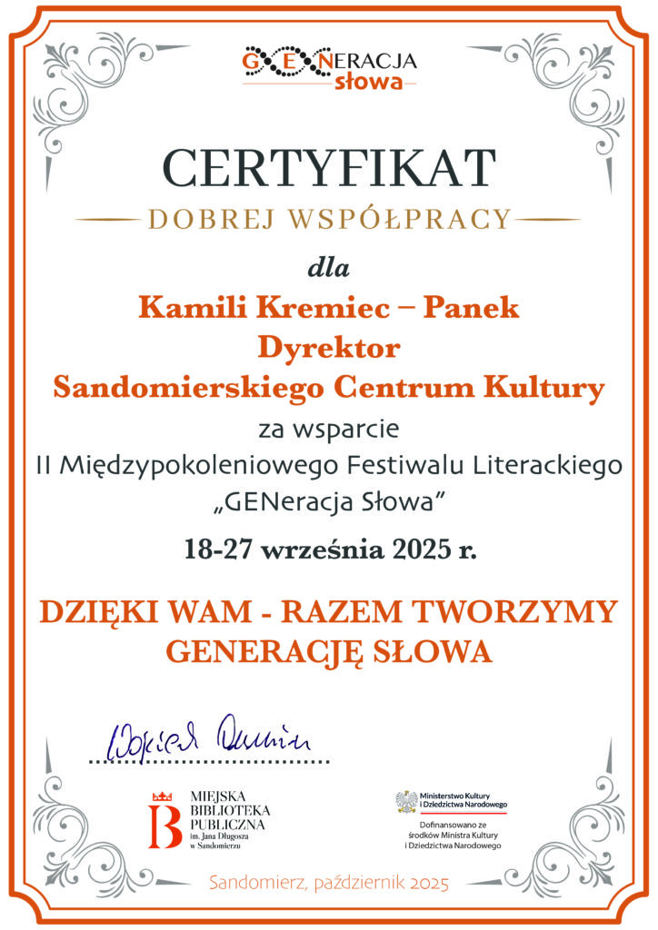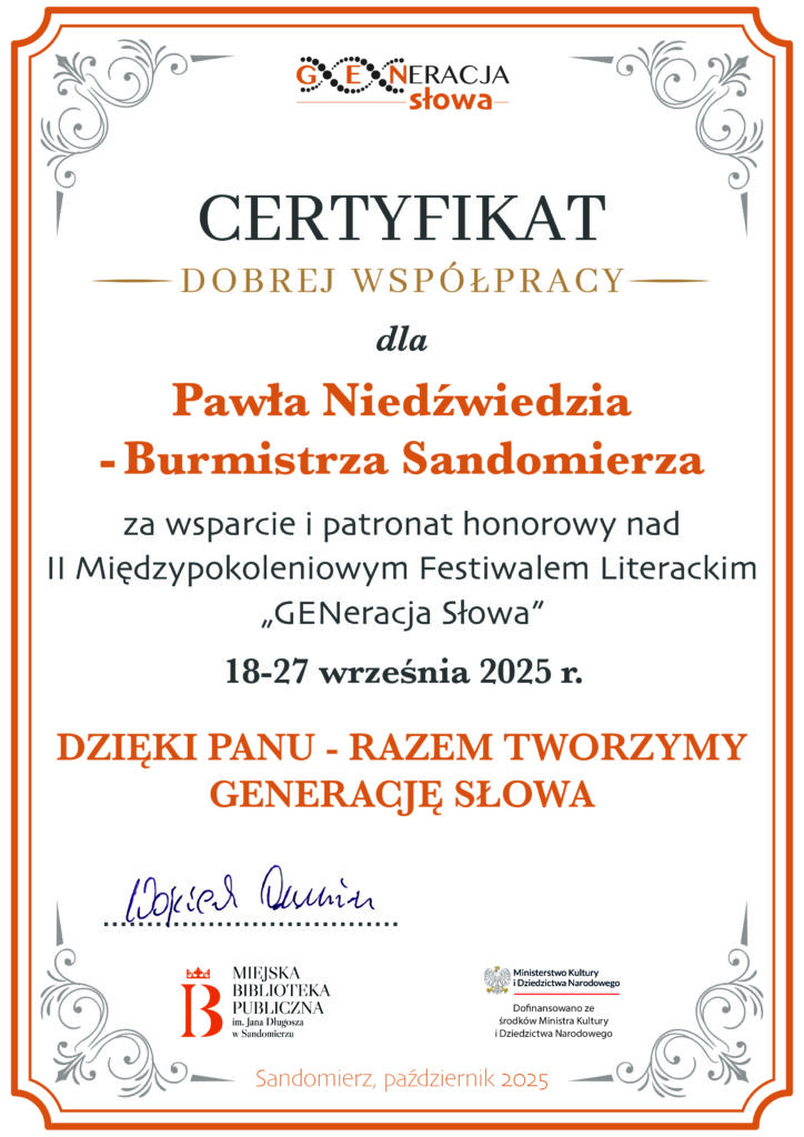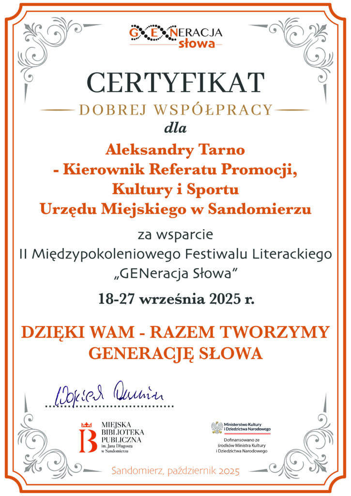 KOMUNIKATY FESTIWALOWE PROGRAM WYDARZENIA KONKURS LITERACKI Regulamin konkursu Formularz zgłoszeniowy WYRÓŻNIENIA ORGANIZATORZY Organizator główny: www.sandomierz.naszabiblioteka.com www.facebook.com/mbpsandomierz Współorganizatorzy: Patronaty honorowe:Wiesław MyśliwskiPaweł Niedźwiedź – Burmistrz Sandomierza Partnerzy: Sponsor: KONTAKT Miejska Biblioteka Publiczna im. Jana Długosza w Sandomierzuul. Parkowa 1 27-600 Sandomierztel.: 15 832 24 10 fax : 15 832 00 93kontakt@generacjaslowa.plZapraszamy do kontaktu!