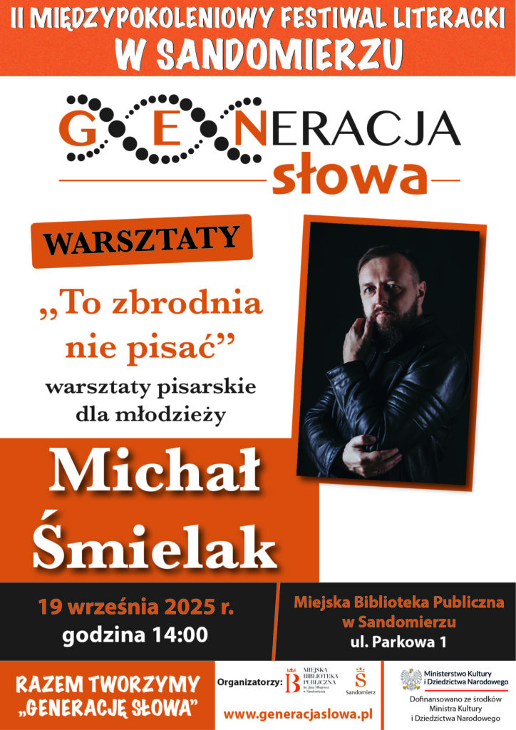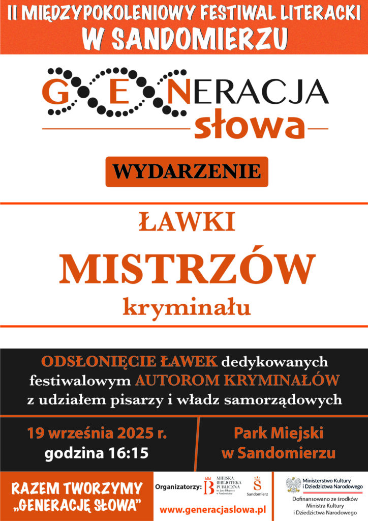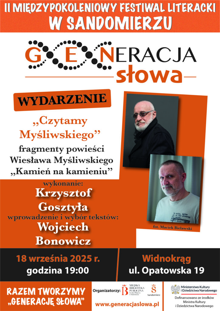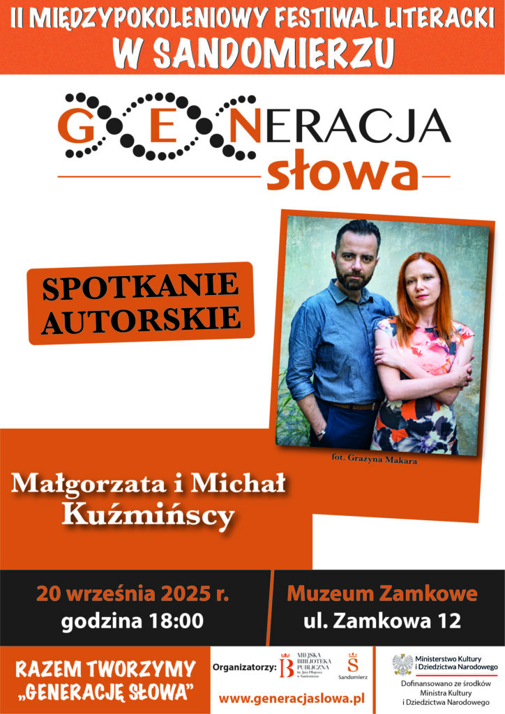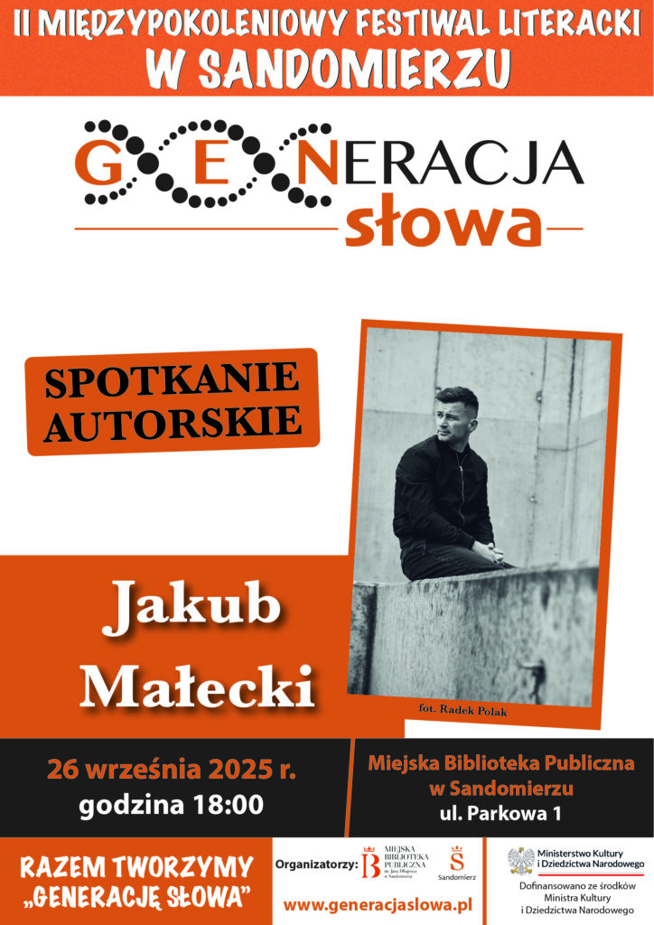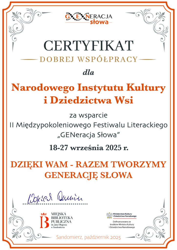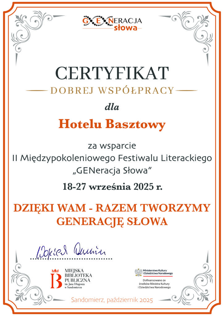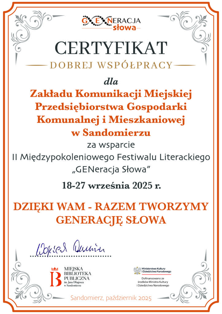 KOMUNIKATY FESTIWALOWE PROGRAM WYDARZENIA KONKURS LITERACKI Regulamin konkursu Formularz zgłoszeniowy WYRÓŻNIENIA ORGANIZATORZY Organizator główny: www.sandomierz.naszabiblioteka.com www.facebook.com/mbpsandomierz Współorganizatorzy: Patronaty honorowe:Wiesław MyśliwskiPaweł Niedźwiedź – Burmistrz Sandomierza Partnerzy: Sponsor: KONTAKT Miejska Biblioteka Publiczna im. Jana Długosza w Sandomierzuul. Parkowa 1 27-600 Sandomierztel.: 15 832 24 10 fax : 15 832 00 93kontakt@generacjaslowa.plZapraszamy do kontaktu!