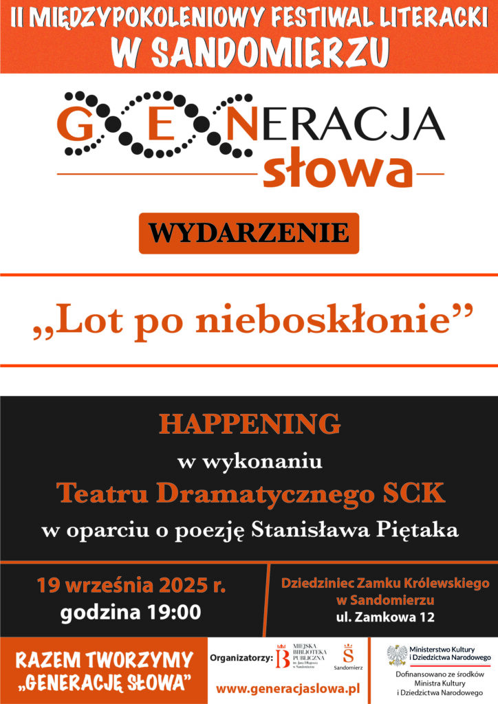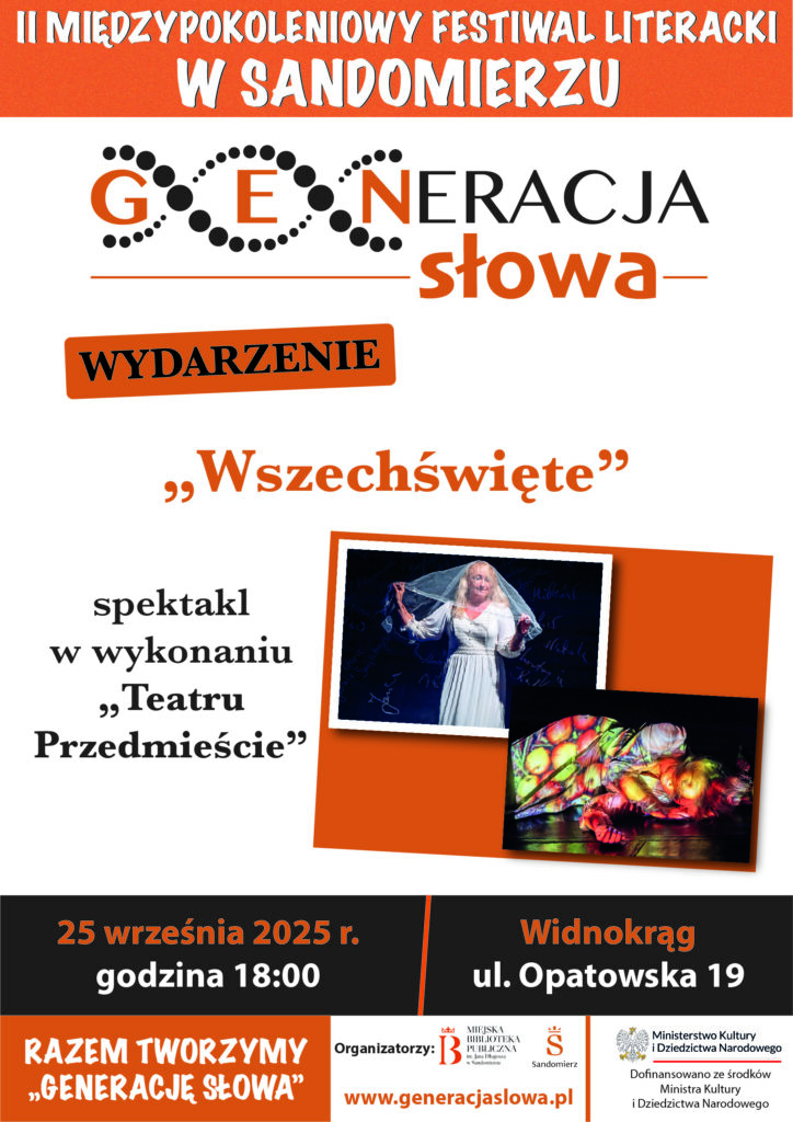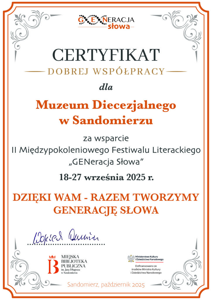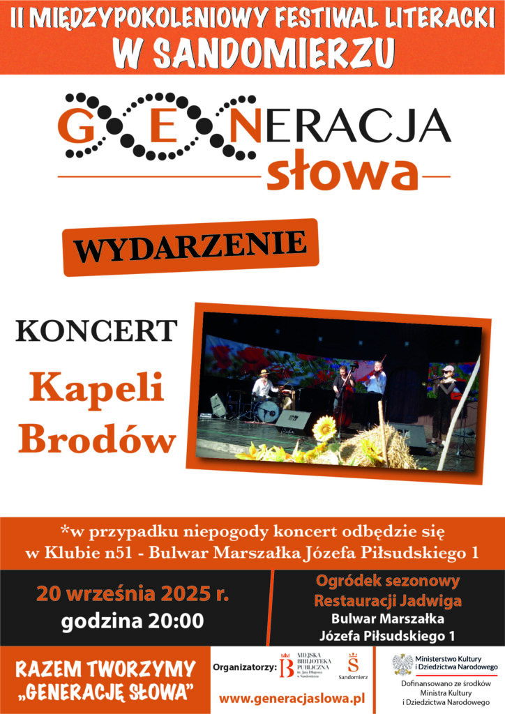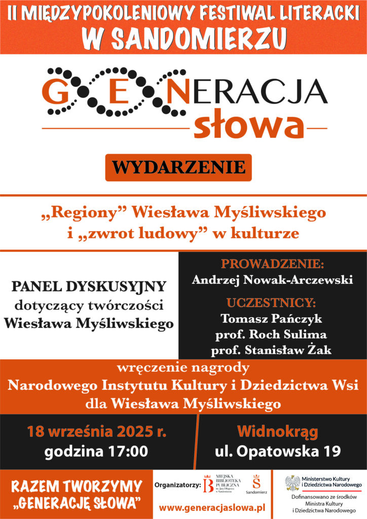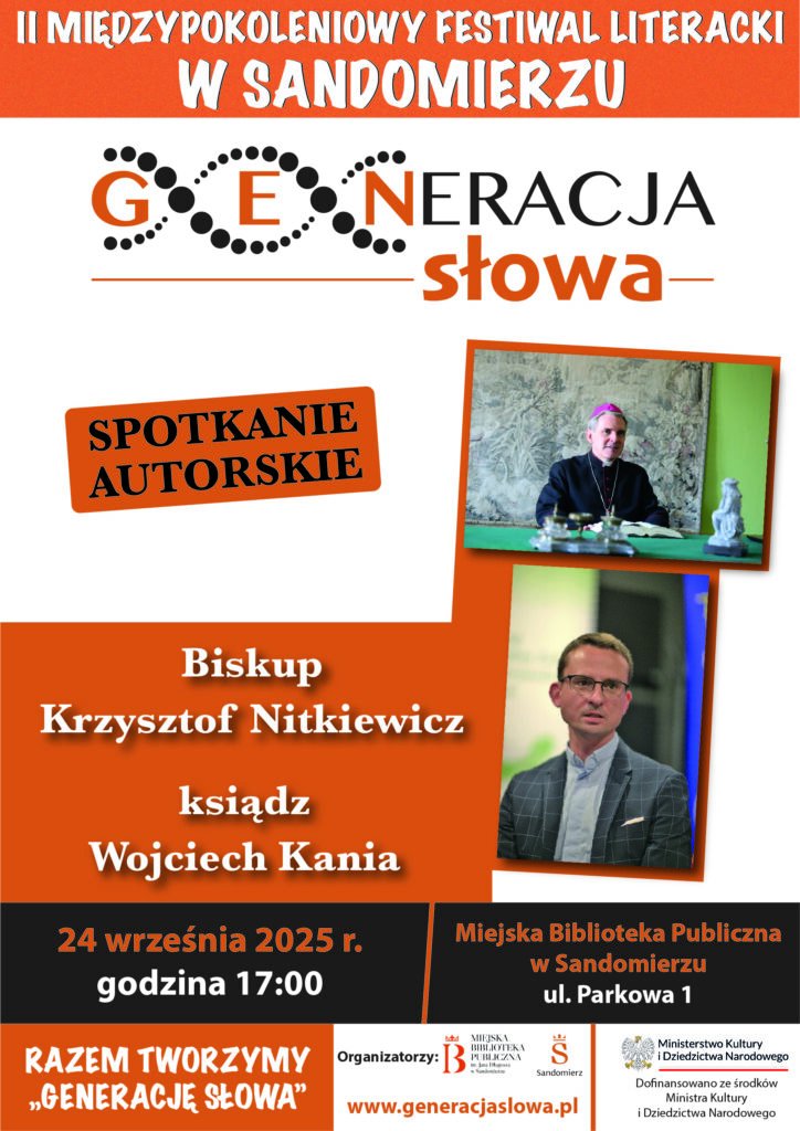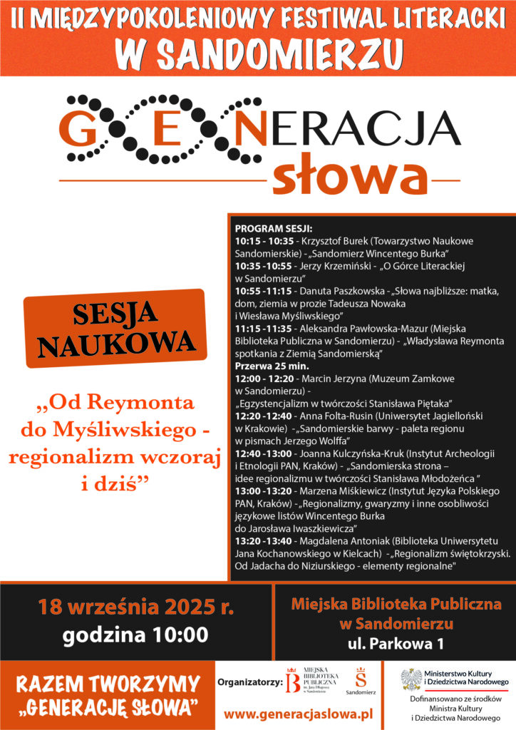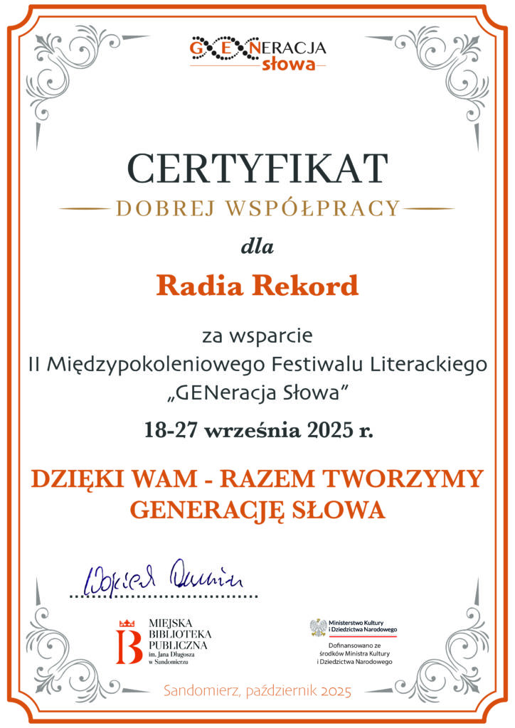 KOMUNIKATY FESTIWALOWE PROGRAM WYDARZENIA KONKURS LITERACKI Regulamin konkursu Formularz zgłoszeniowy WYRÓŻNIENIA ORGANIZATORZY Organizator główny: www.sandomierz.naszabiblioteka.com www.facebook.com/mbpsandomierz Współorganizatorzy: Patronaty honorowe:Wiesław MyśliwskiPaweł Niedźwiedź – Burmistrz Sandomierza Partnerzy: Sponsor: KONTAKT Miejska Biblioteka Publiczna im. Jana Długosza w Sandomierzuul. Parkowa 1 27-600 Sandomierztel.: 15 832 24 10 fax : 15 832 00 93kontakt@generacjaslowa.plZapraszamy do kontaktu!