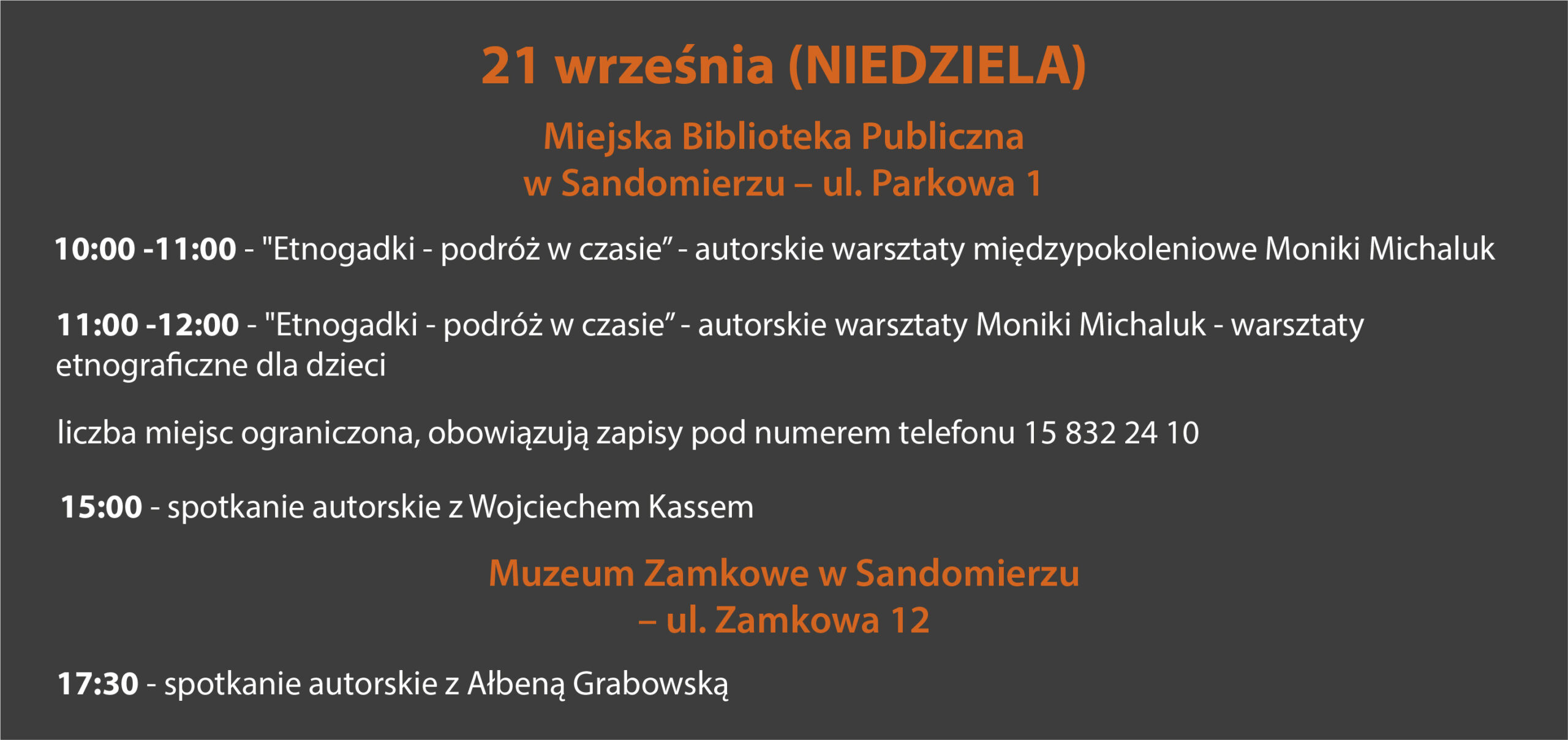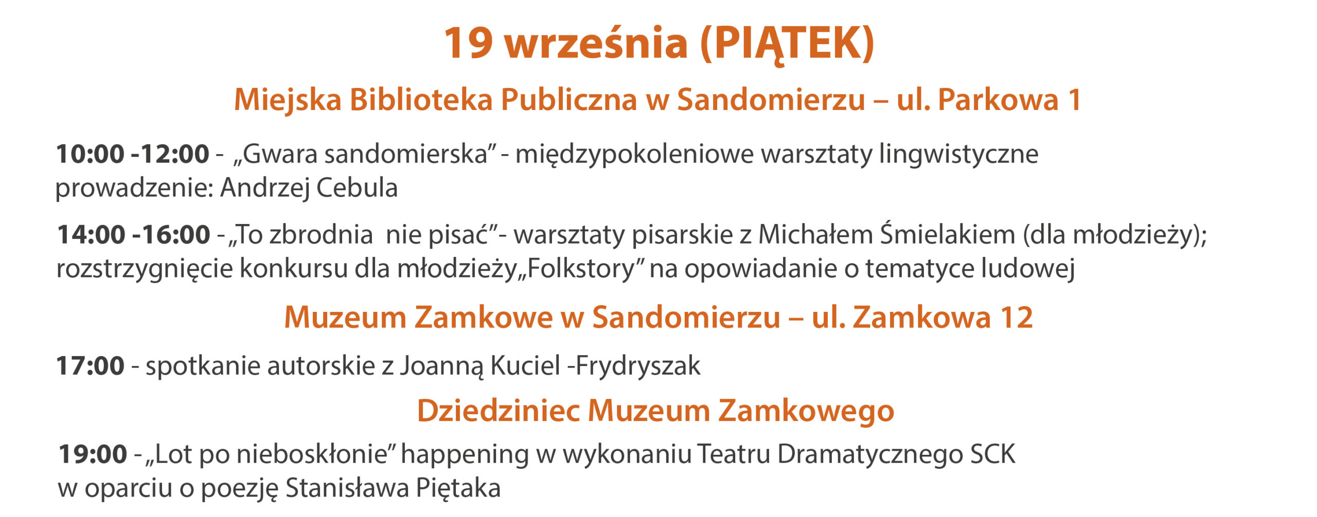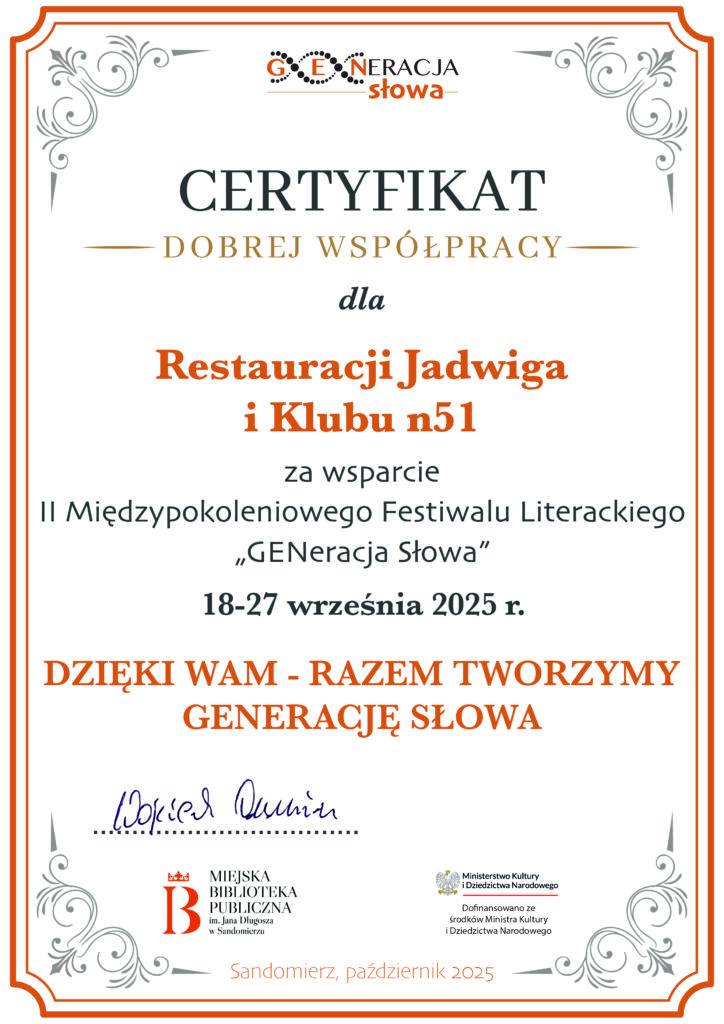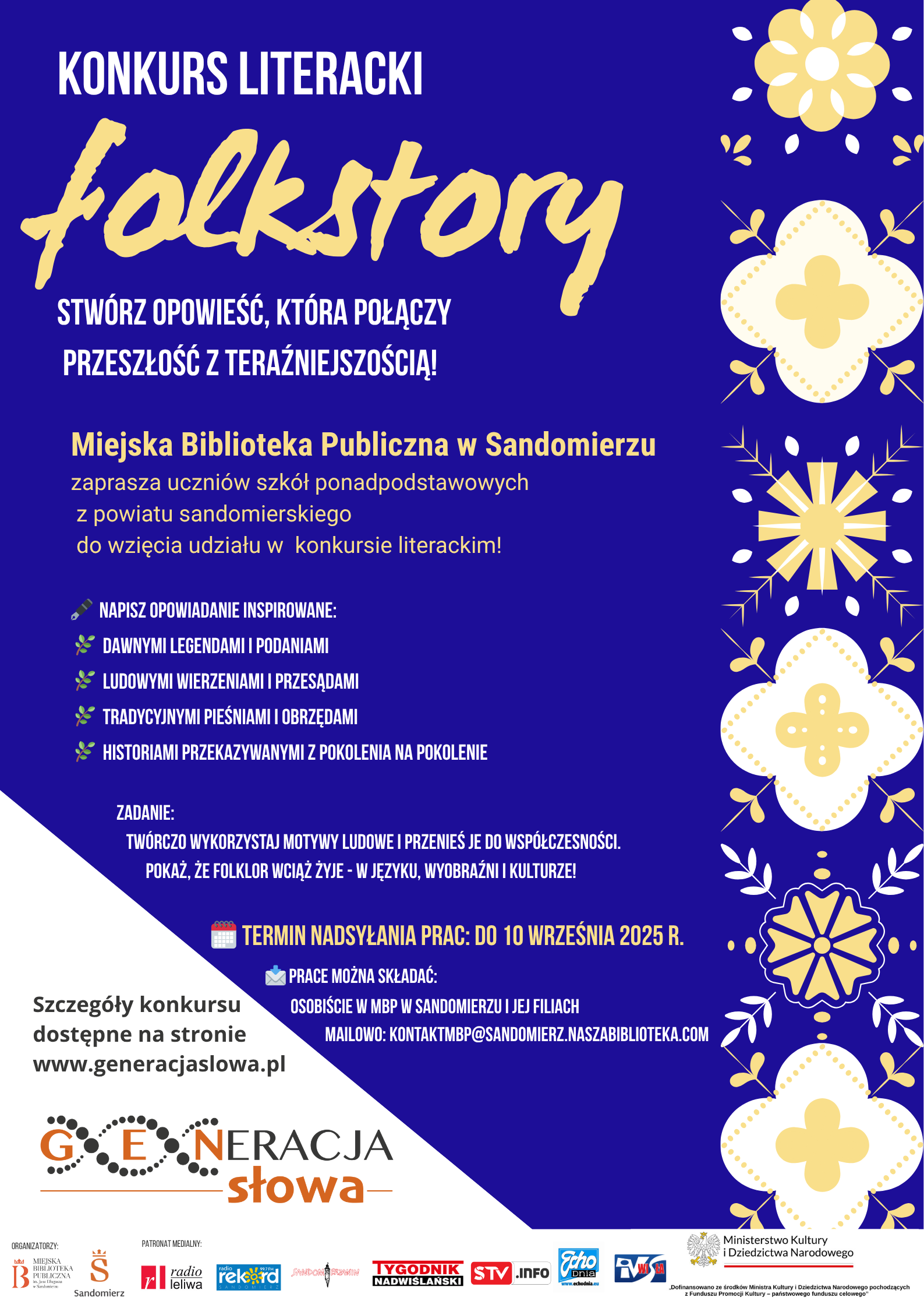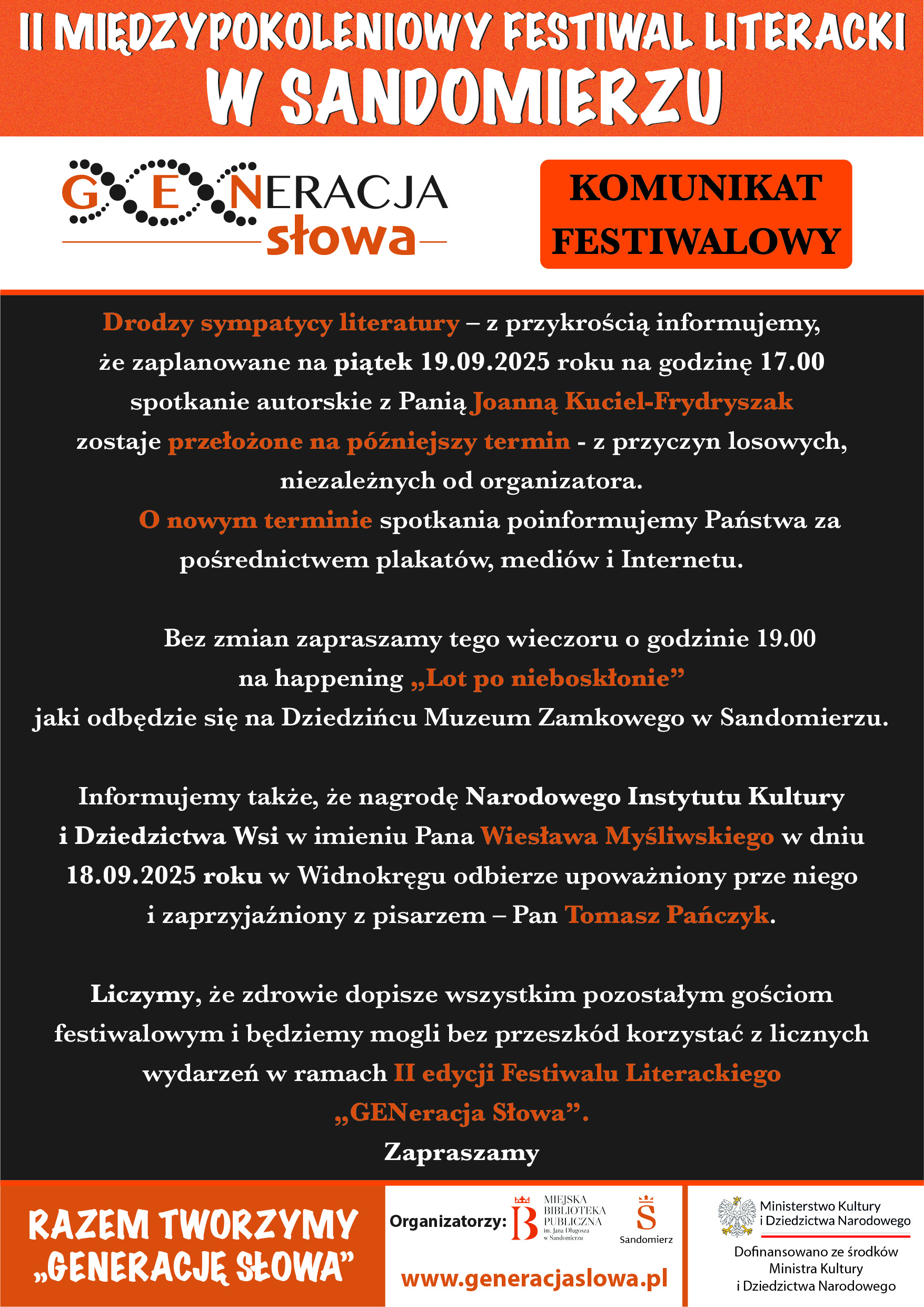 KOMUNIKATY FESTIWALOWE PROGRAM WYDARZENIA KONKURS LITERACKI Regulamin konkursu Formularz zgłoszeniowy WYRÓŻNIENIA ORGANIZATORZY Organizator główny: www.sandomierz.naszabiblioteka.com www.facebook.com/mbpsandomierz Współorganizatorzy: Patronaty honorowe:Wiesław MyśliwskiPaweł Niedźwiedź – Burmistrz Sandomierza Partnerzy: Sponsor: KONTAKT Miejska Biblioteka Publiczna im. Jana Długosza w Sandomierzuul. Parkowa 1 27-600 Sandomierztel.: 15 832 24 10 fax : 15 832 00 93kontakt@generacjaslowa.plZapraszamy do kontaktu!