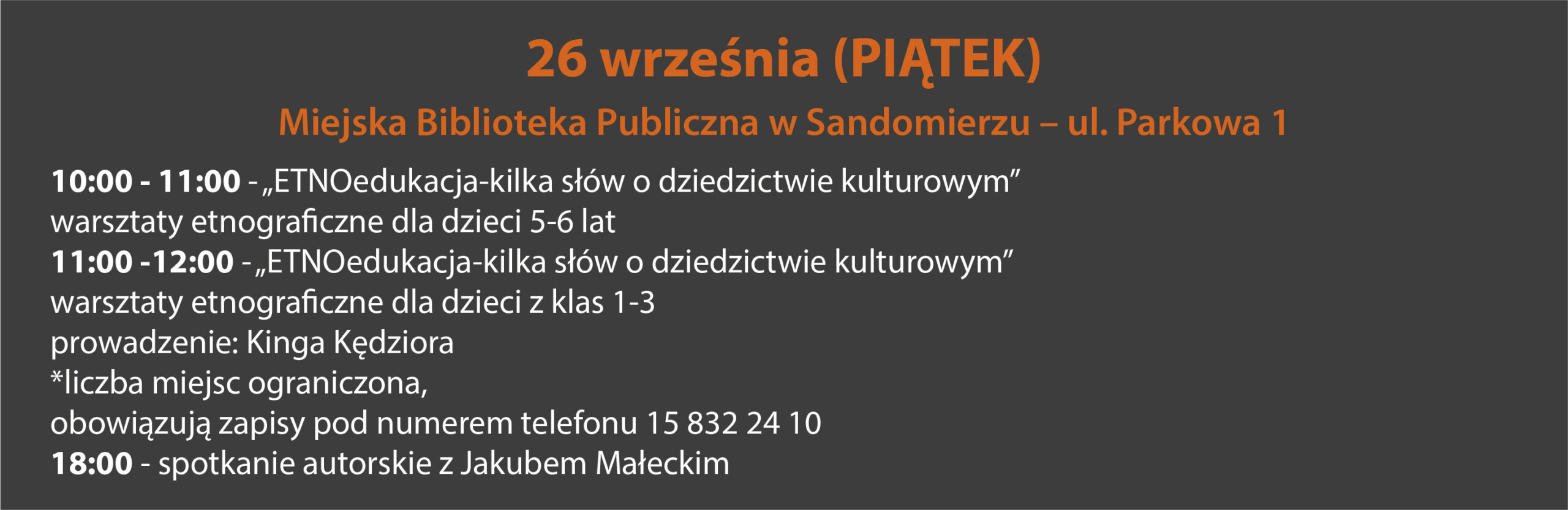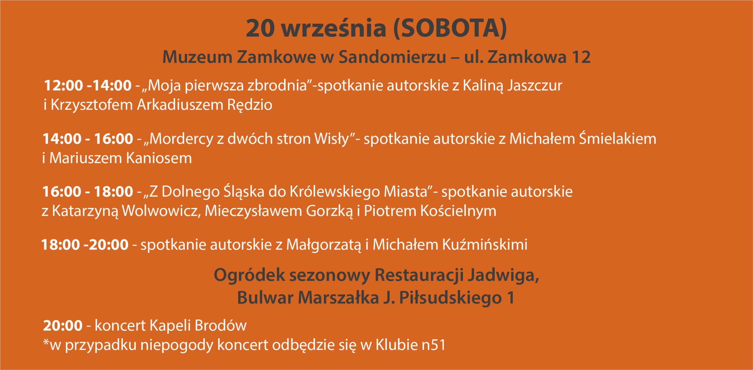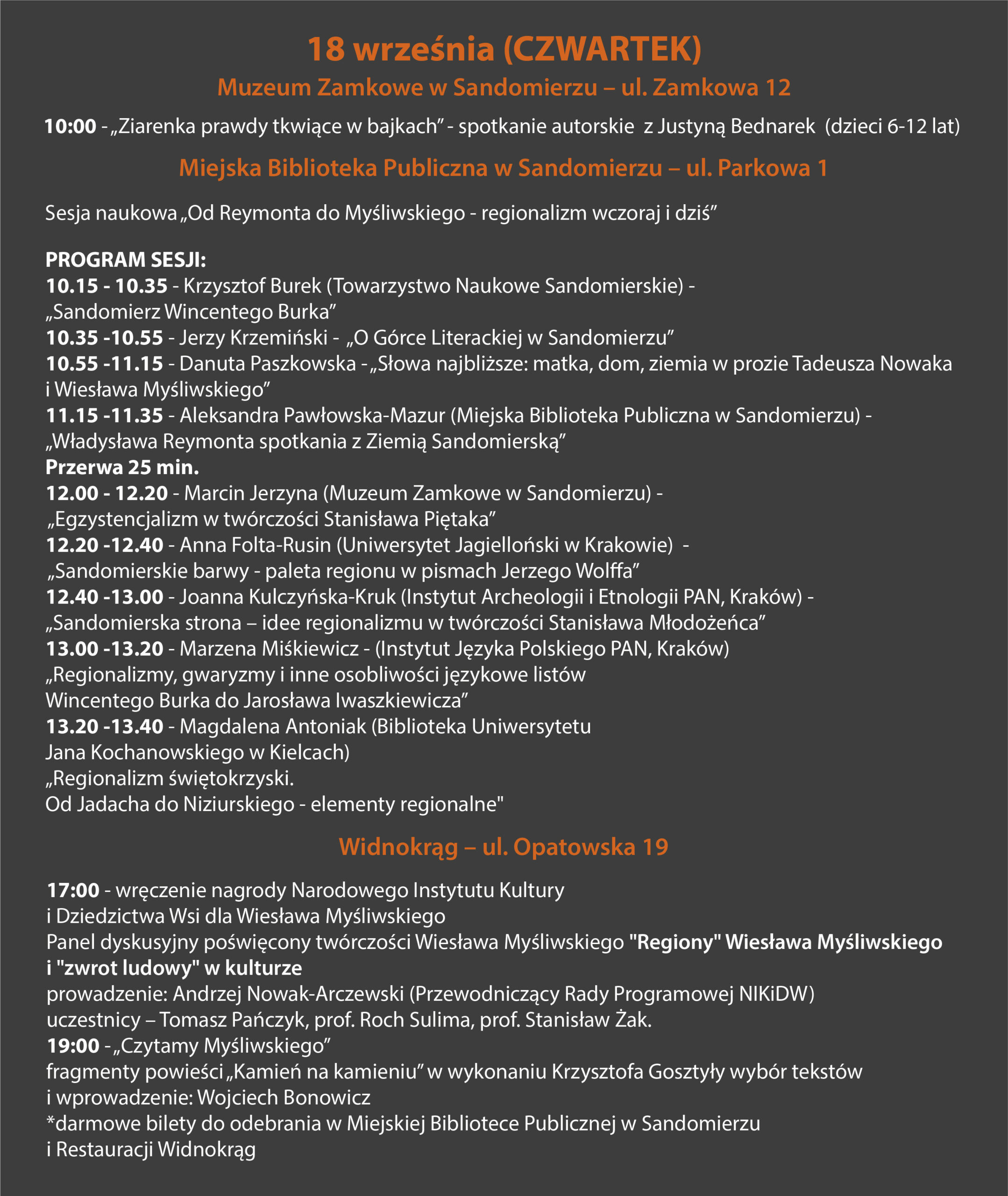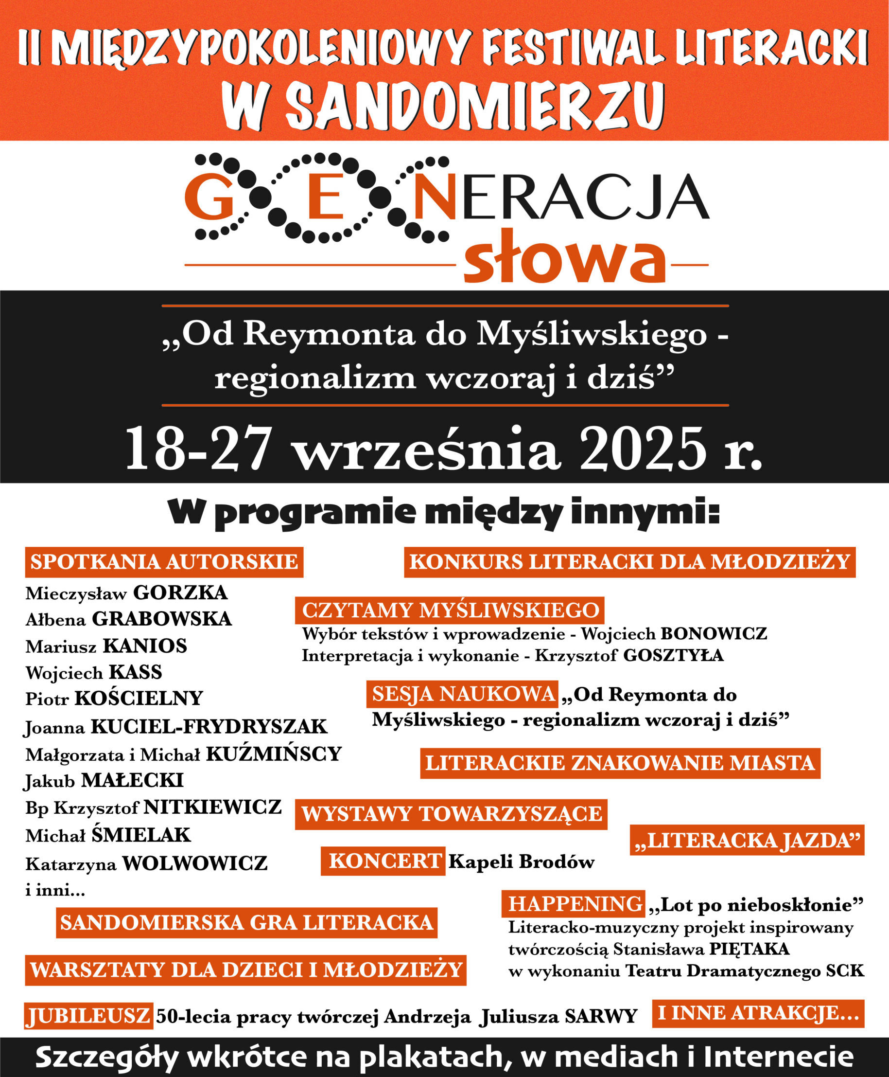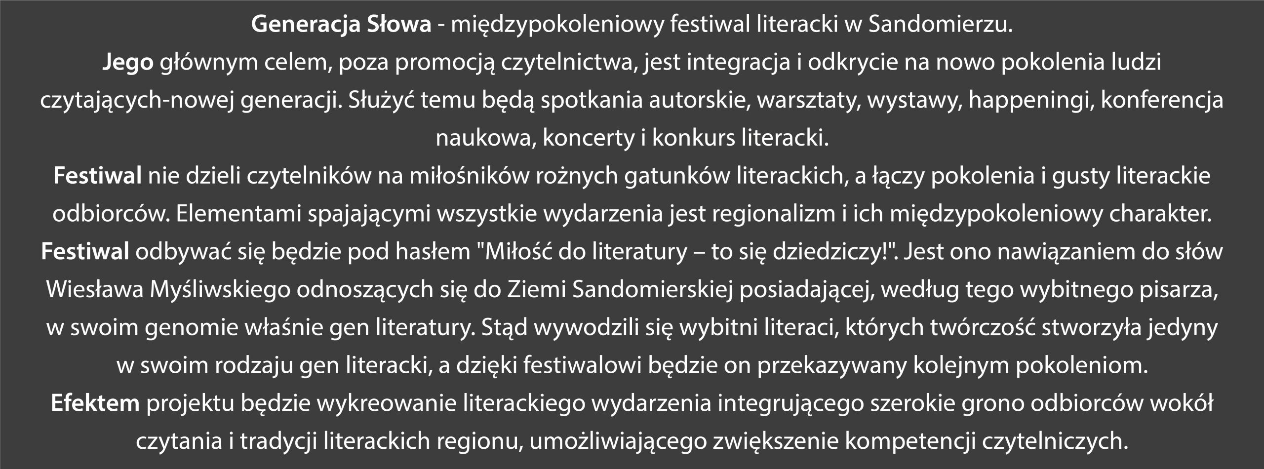 KOMUNIKATY FESTIWALOWE PROGRAM WYDARZENIA KONKURS LITERACKI Regulamin konkursu Formularz zgłoszeniowy WYRÓŻNIENIA ORGANIZATORZY Organizator główny: www.sandomierz.naszabiblioteka.com www.facebook.com/mbpsandomierz Współorganizatorzy: Patronaty honorowe:Wiesław MyśliwskiPaweł Niedźwiedź – Burmistrz Sandomierza Partnerzy: Sponsor: KONTAKT Miejska Biblioteka Publiczna im. Jana Długosza w Sandomierzuul. Parkowa 1 27-600 Sandomierztel.: 15 832 24 10 fax : 15 832 00 93kontakt@generacjaslowa.plZapraszamy do kontaktu!