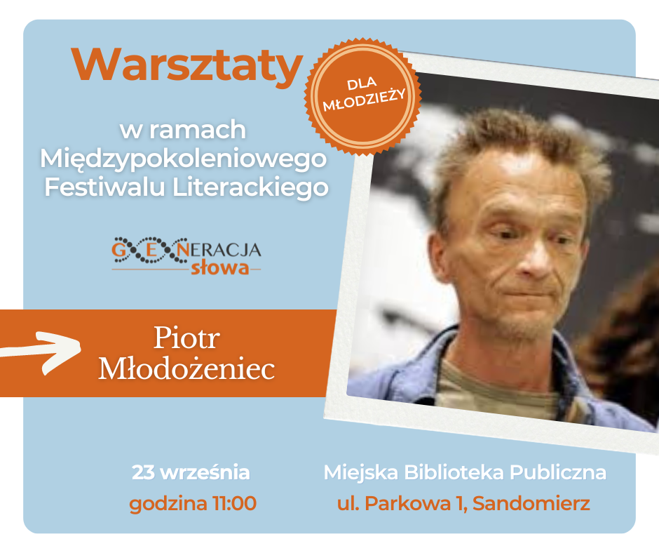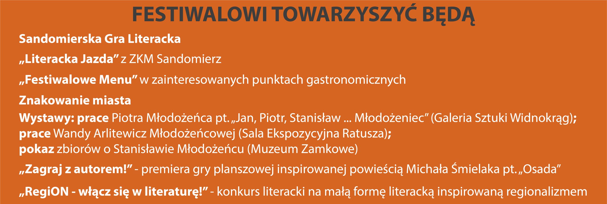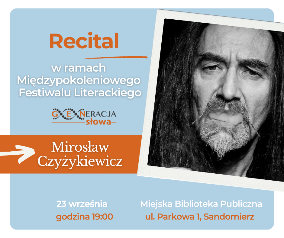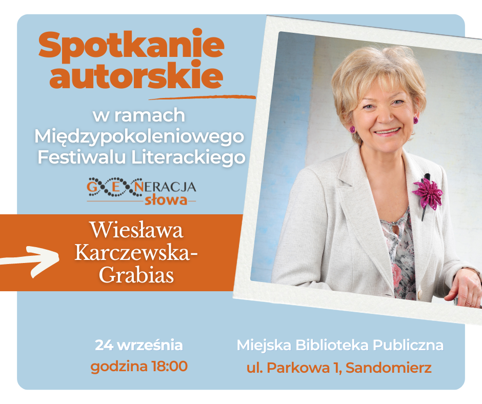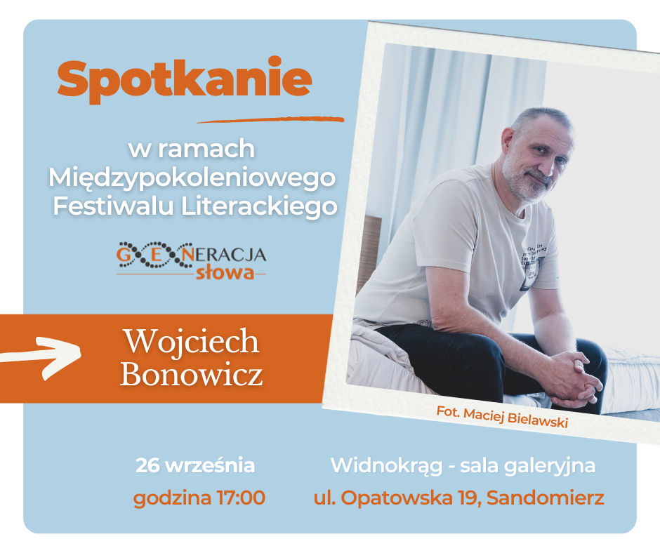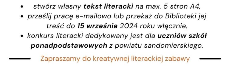ARCHIWUM 2024 PROGRAM Plakat Festiwalu ARTYŚCI KONFERENCJA NAUKOWA O konferencji w Biuletynie Polonistycznym WYSTAWA KONKURS LITERACKI Regulamin konkursu Formularz zgłoszeniowy Nagrodzone Prace Konkursowe - edycja 2024 I MIEJSCE - Karolina Rosicka II MIEJSCE - Natalia Mazut III MIEJSCE - Anna Łączkowska LITERACKA JAZDA ORGANIZATORZY Organizator główny: www.sandomierz.naszabiblioteka.com www.facebook.com/mbpsandomierzPozostali: PATRONAT HONOROWY – Paweł Niedźwiedź Burmistrz Sandomierza
