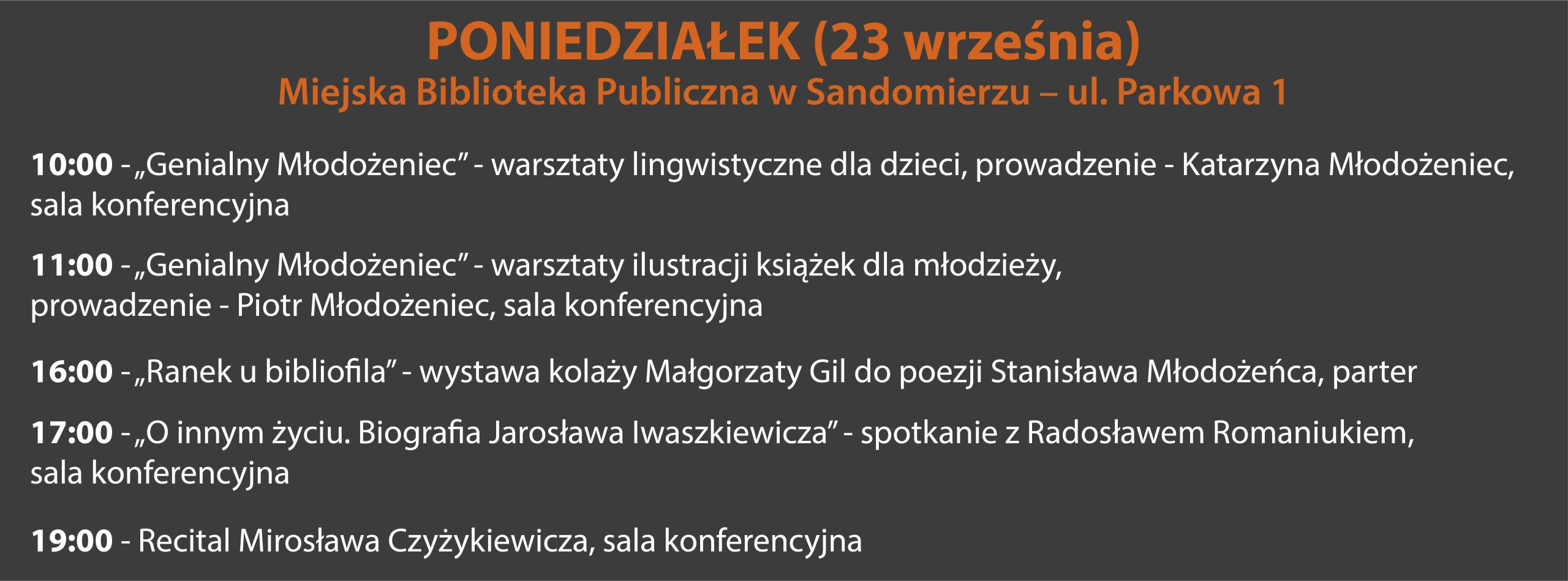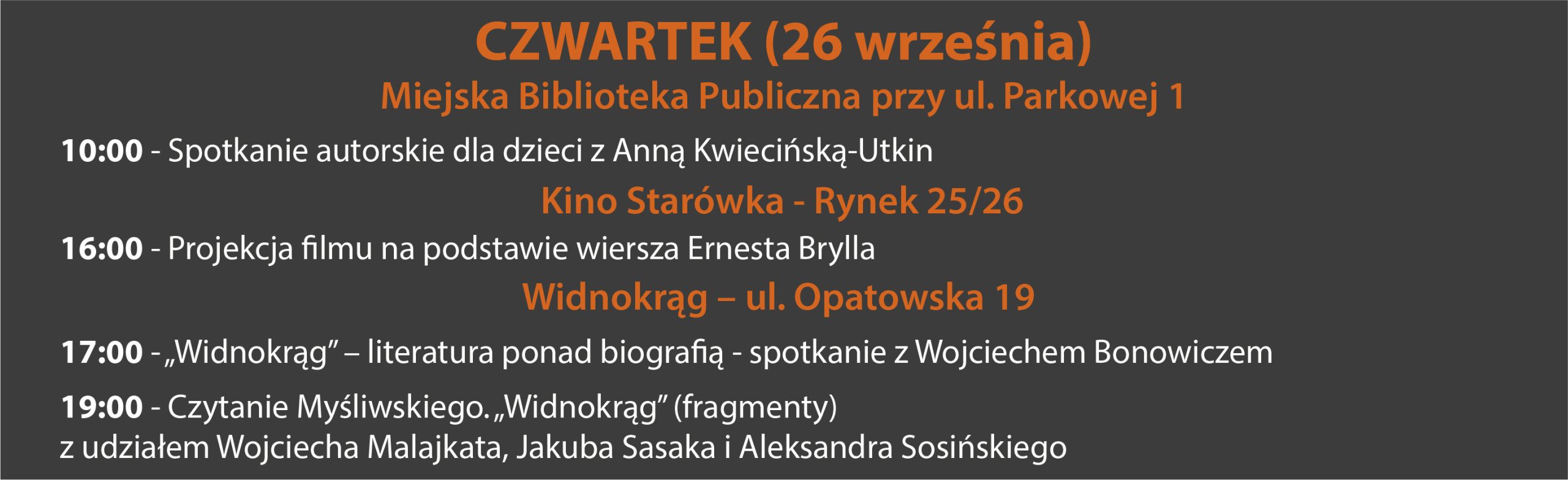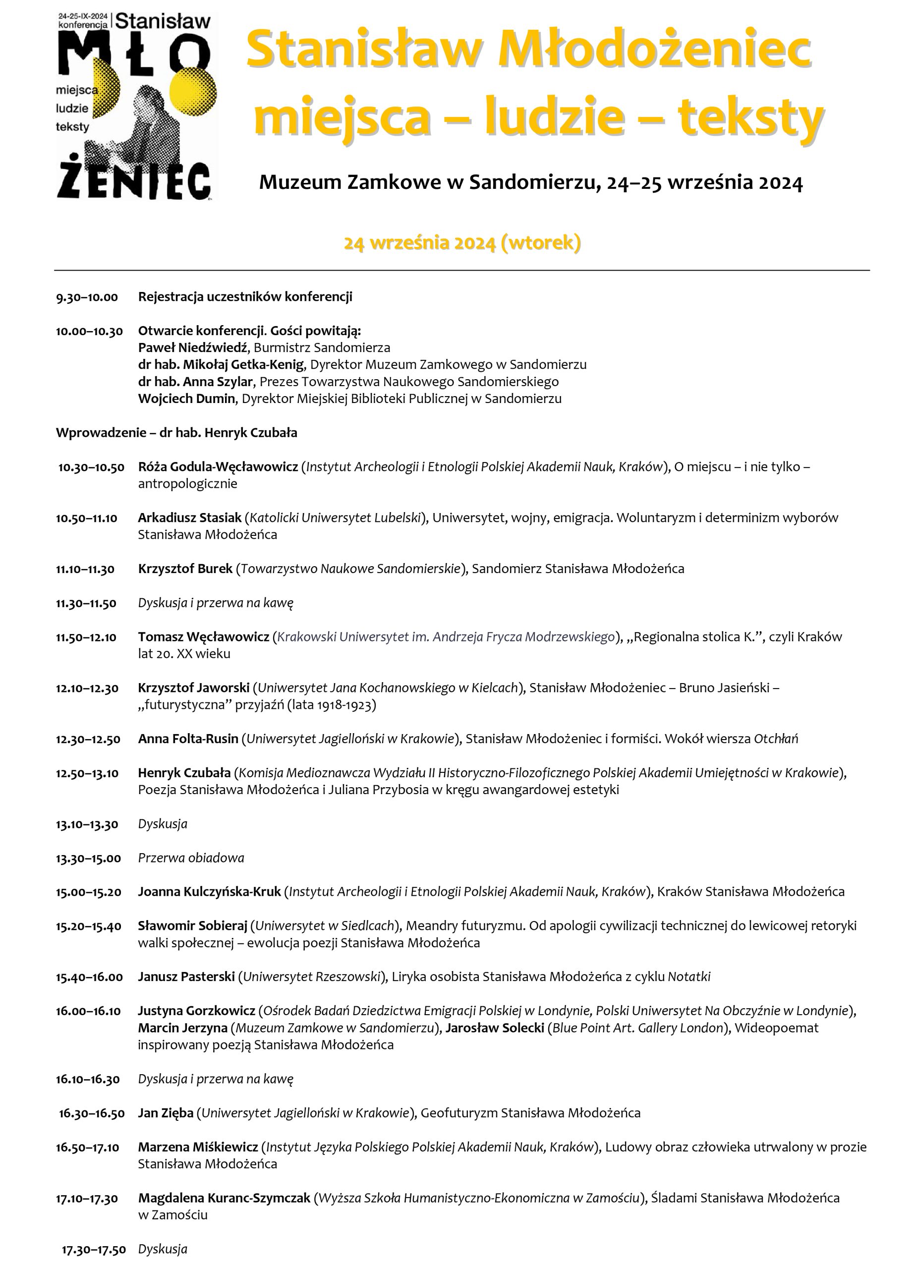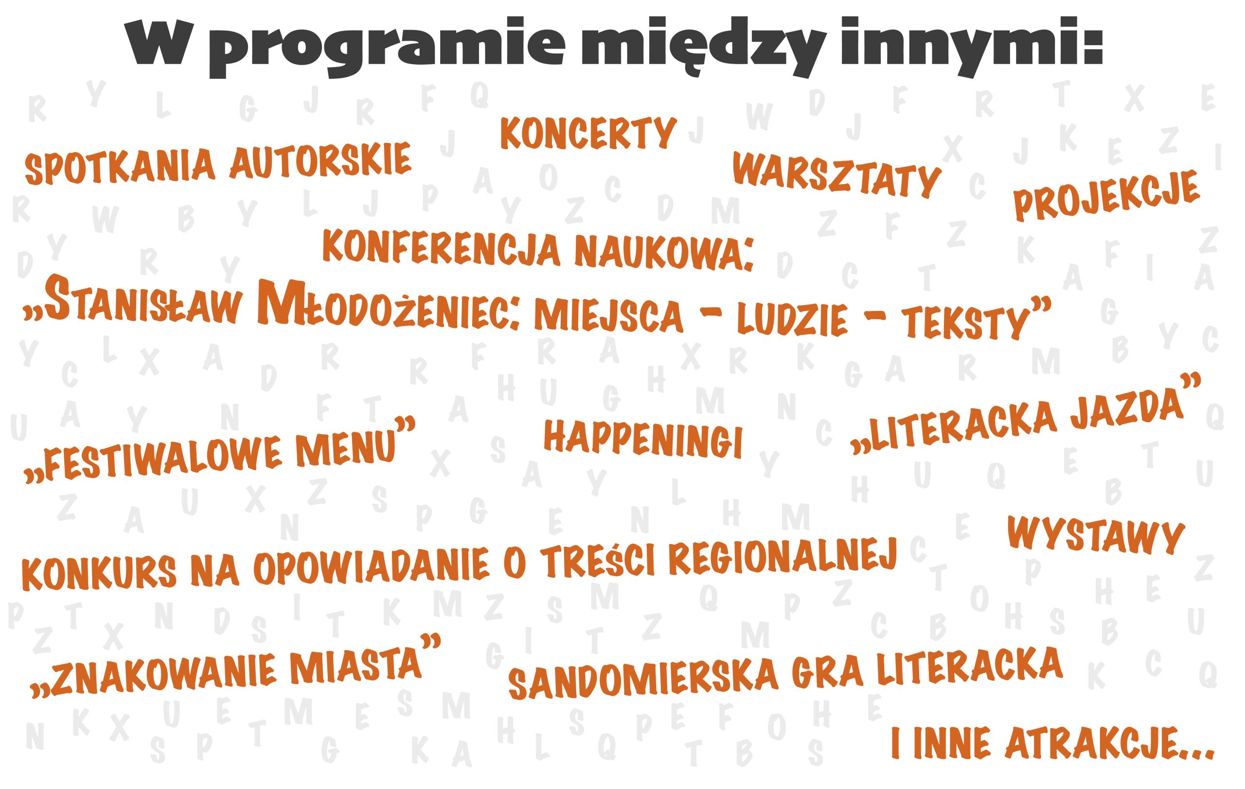 ARCHIWUM 2024 PROGRAM Plakat Festiwalu ARTYŚCI KONFERENCJA NAUKOWA O konferencji w Biuletynie Polonistycznym WYSTAWA KONKURS LITERACKI Regulamin konkursu Formularz zgłoszeniowy Nagrodzone Prace Konkursowe - edycja 2024 I MIEJSCE - Karolina Rosicka II MIEJSCE - Natalia Mazut III MIEJSCE - Anna Łączkowska LITERACKA JAZDA ORGANIZATORZY Organizator główny: www.sandomierz.naszabiblioteka.com www.facebook.com/mbpsandomierzPozostali: PATRONAT HONOROWY – Paweł Niedźwiedź Burmistrz Sandomierza